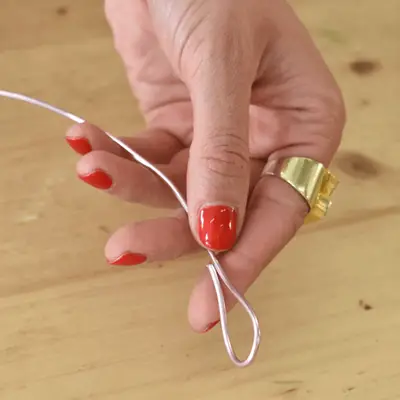 Sie müssen Ihrer Messung zwei zusätzliche Zentimeter hinzufügen, damit Sie an den beiden Enden eine Schleife machen können (siehe Passage 2).