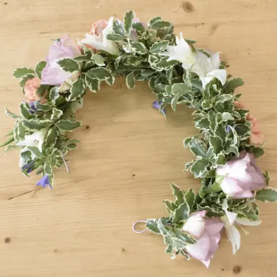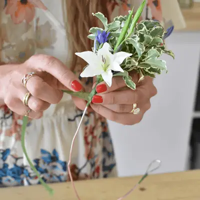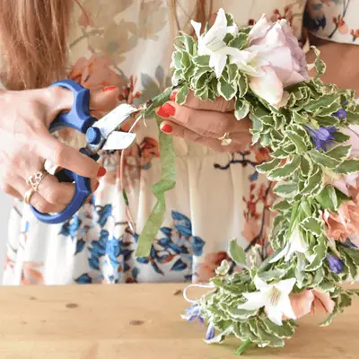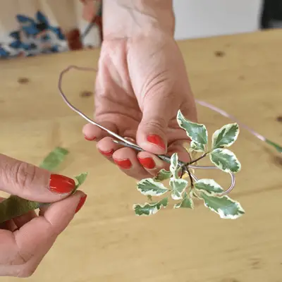 Wenn Sie das Ende Ihrer Krone erreichen, fixieren Sie das letzte Stück Laub in Position und wickeln Sie es streng mit dem floristischen Band ein.