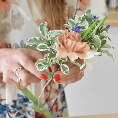 Anregung: Wählen Sie einen Blumenstrauß mit Holz oder starre Stielen, während sie länger vom Wasser dauern. Rose, Garofani, Leukospermum, Celosia und Blatt wie Ruscus und Eucalyptus sind alles großartige Entscheidungen.